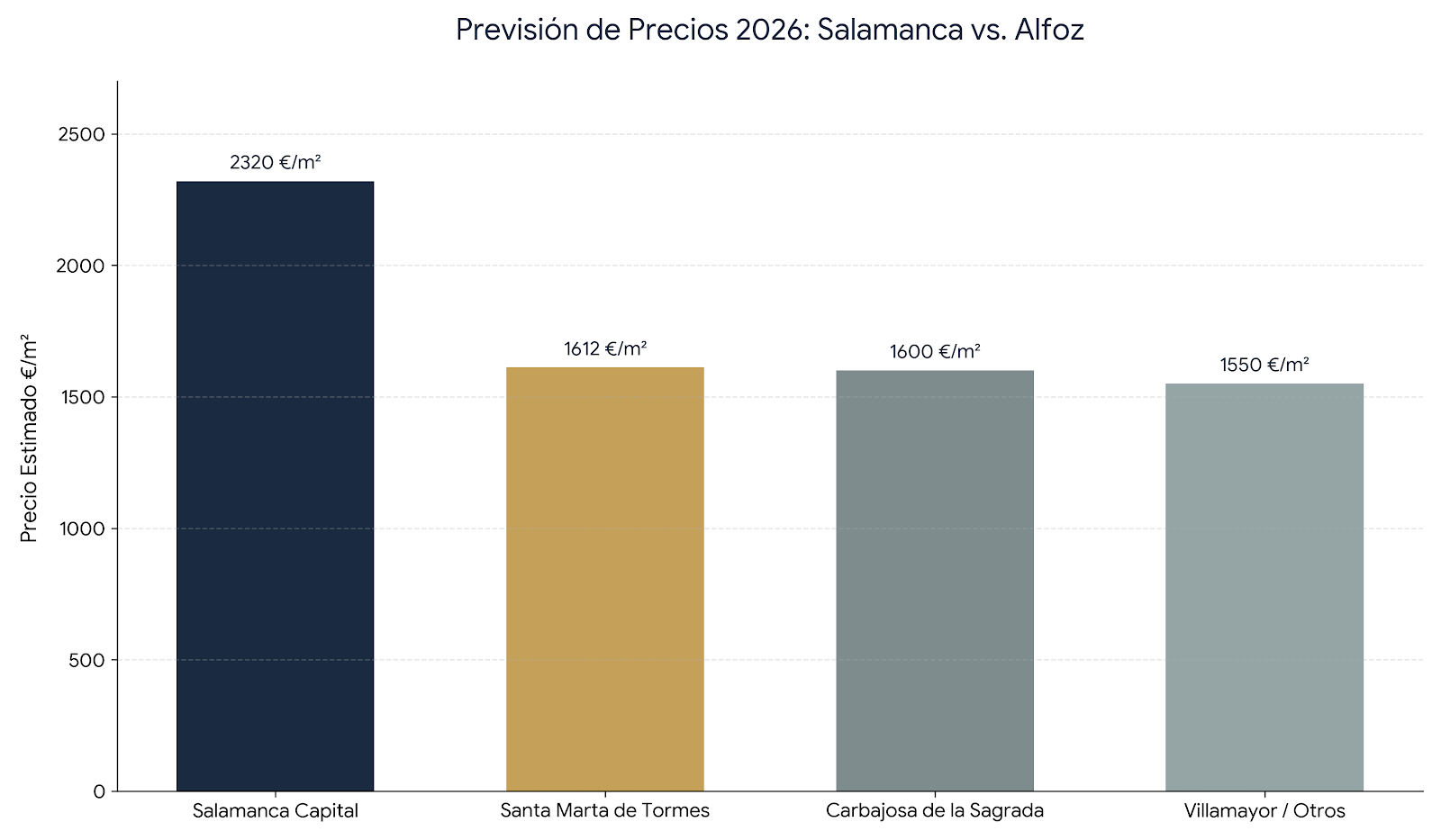 Santa Marta de Tormes: Se consolida como la "segunda capital". El precio del piso medio ha subido un 9%, situándose en torno a los 1.612 €/m². Es la zona con mayor liquidez (donde más rápido se vende).