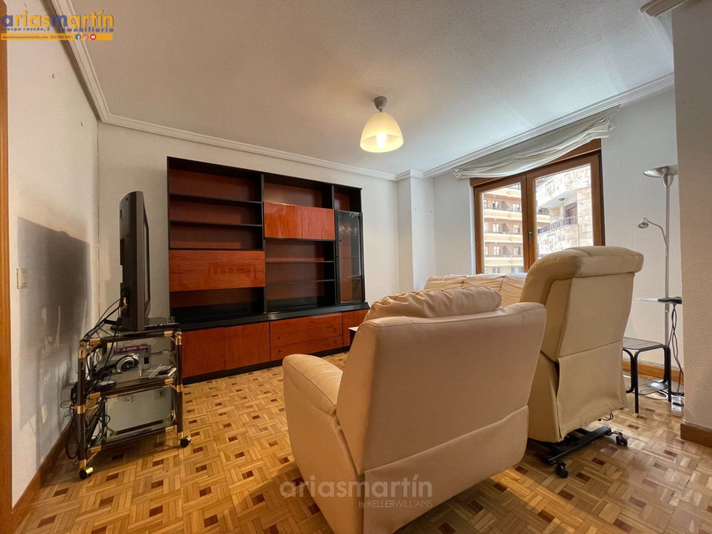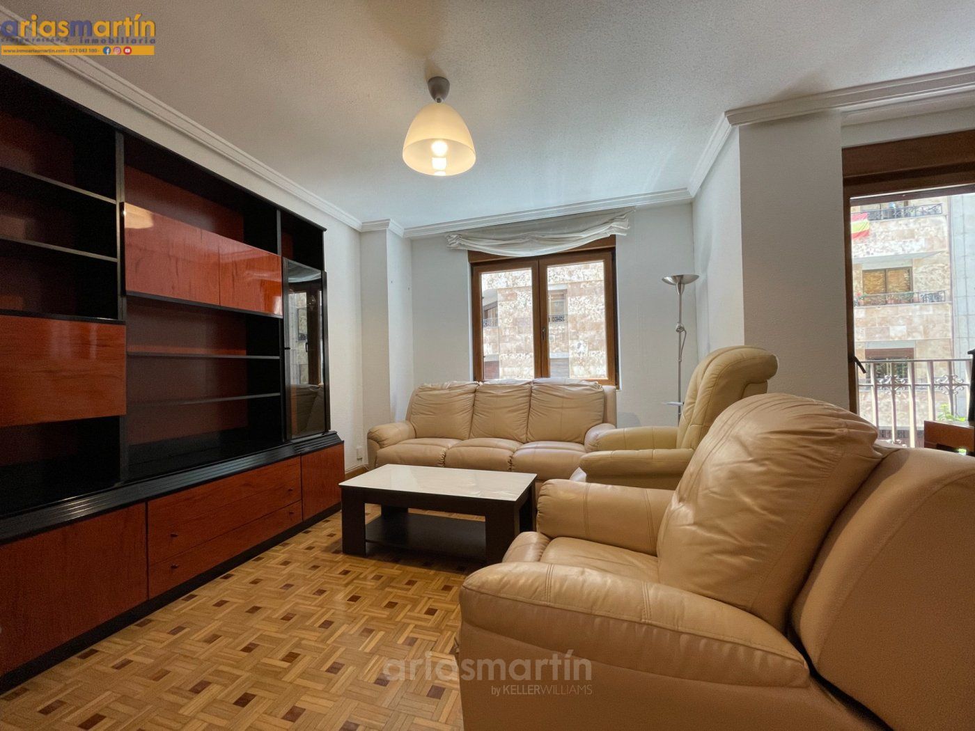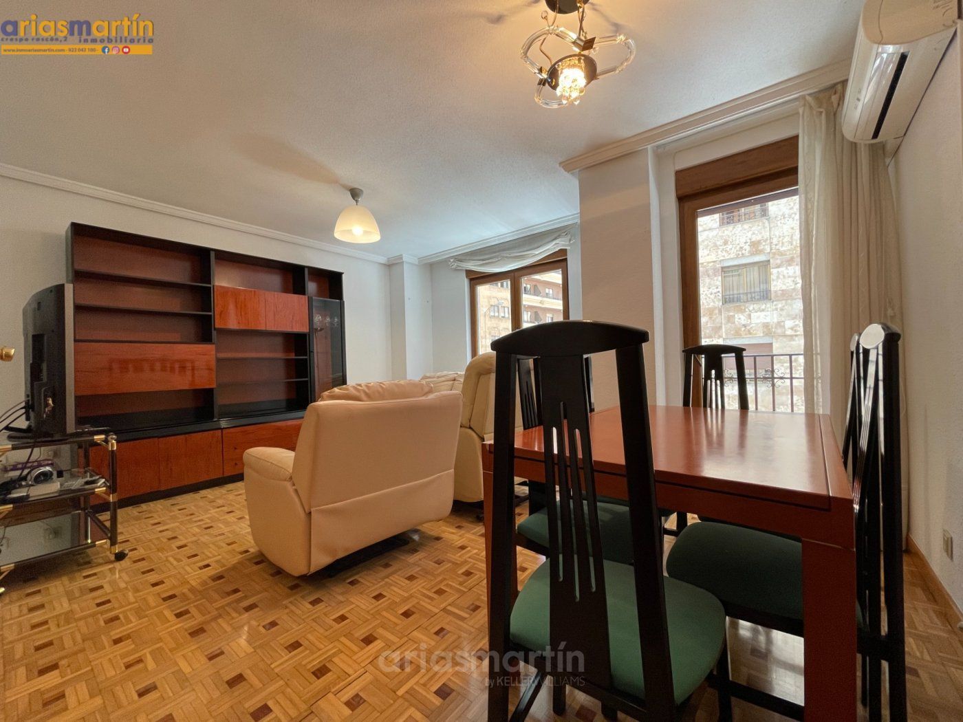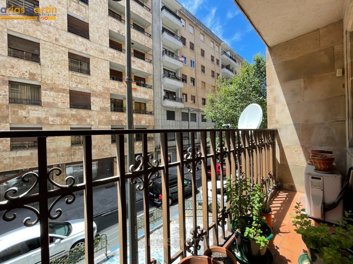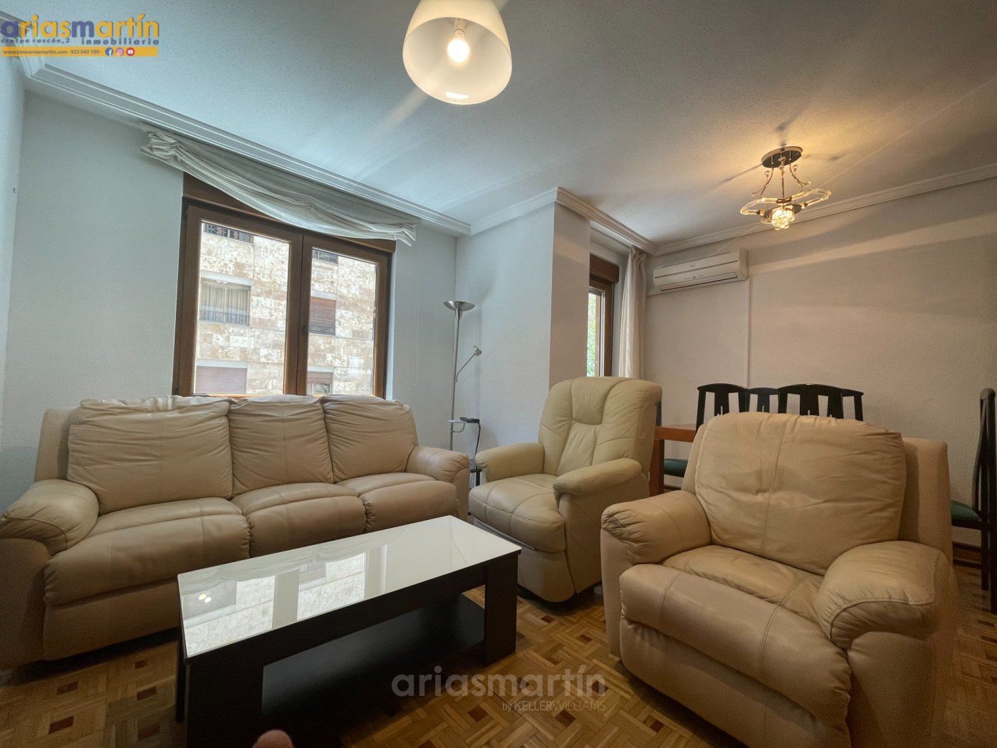 Arias Martín Inmobiliarias de Salamanca te ofrece esta vivienda que se encuentra en una primera planta en un edificio con ascensor que tiene unos 100m2 útiles distribuidos en 3 dormitorios (2 de ellos grandes y uno más pequeño) todos amueblados (en las fotos están pendientes de completar), 2 baños completos, impresionante cocina equipada con electrodomésticos de primeras marcas, patio comunitario con trastero, amplio salón con sillones de cuero y aire acondicionado y balcón.